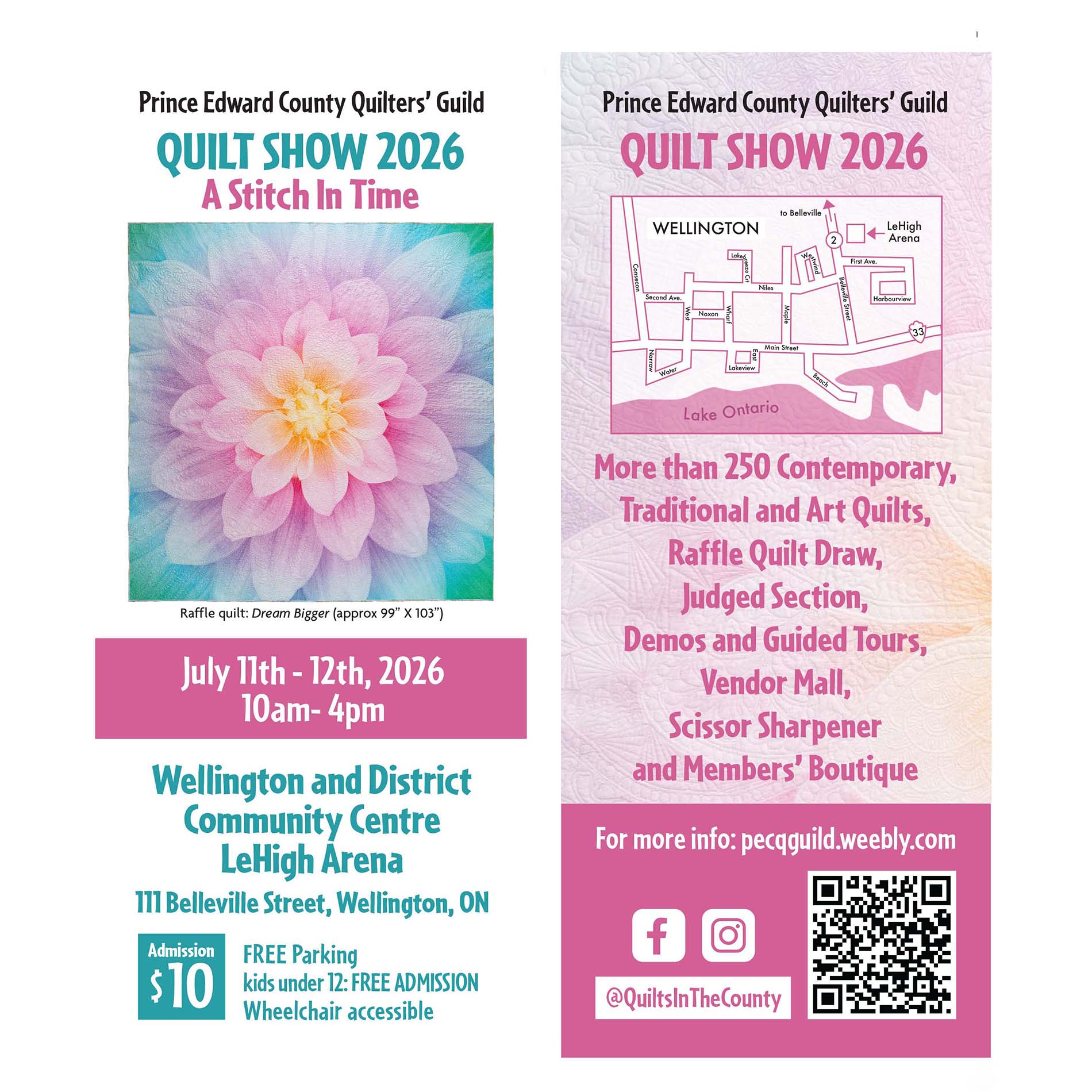 Come visit the Prince Edward County Quilters’ Guild Quilt Show 2026 – A Stitch in Time in Wellington, Ontario Our show will feature more than 250 contemporary, traditional and art quilts, a raffle quilt draw, judged section, demos, guided tours, vendor mall, scissor sharpener and a member’s boutique. There is ample parking, and there is guaranteed to be many gorgeous quilts! We are nearby wonderful wineries, beautiful boutiques, terrific quilt stores, and Sandbanks Provincial Park. Come for the day, or weekend or stay for a holiday!