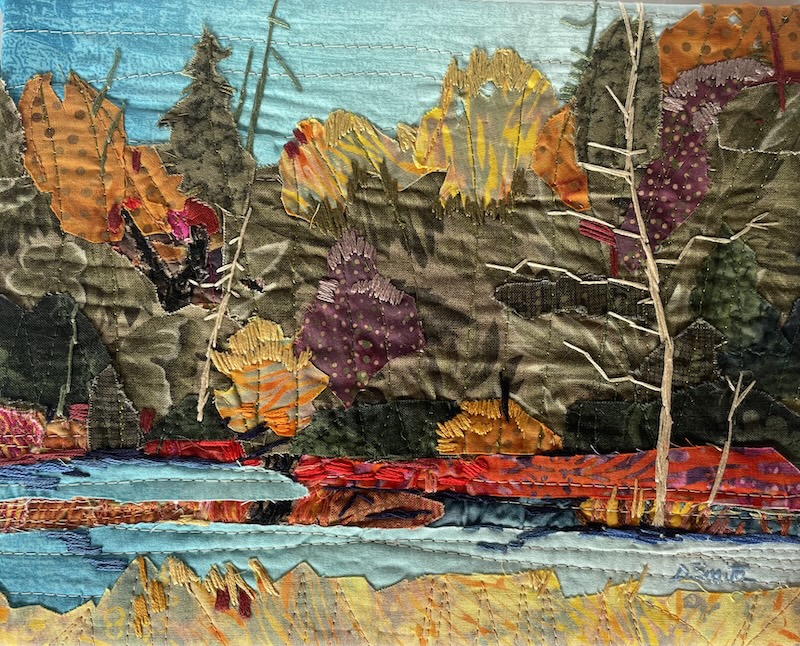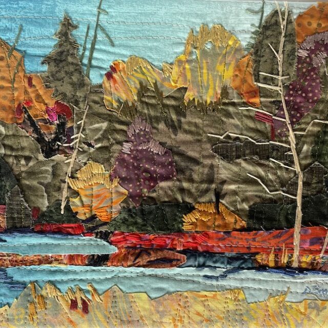 Debby's landscape show highlights the vibrant interplay of color within the fabric and the dynamic lines formed by stitches. Her creations reflect her passion for nature, especially trees and plants.